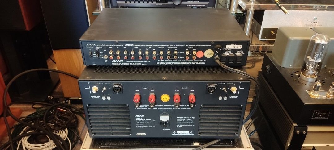 • Classic Adcom System – The Adcom GFP-555 Preamp and GFA-5800 Power Amp, introduced in the early 1990s, deliver robust solid-state performance with high-current Class AB amplification, offering strong dynamics and clean, authoritative control.