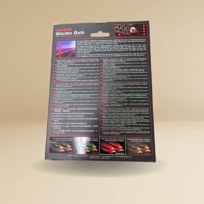 • Overview – The AudioQuest Golden Gate Analogue RCA, released in 2013, is a solid-core copper analogue interconnect designed to deliver clean, low-distortion signal transfer between source components, preamplifiers, and integrated amplifiers.